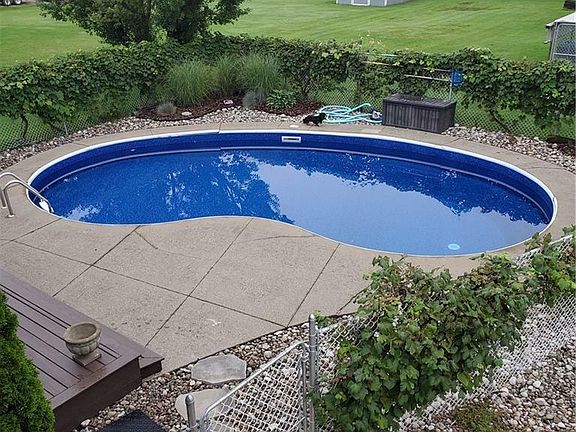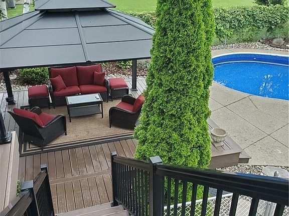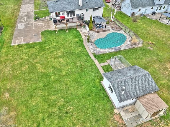If your looking for a semi rural setting with almost an acre of property and City services, take a look at this all brick raised ranch. Major updates in 2015 include roof, some windows, furnace, air conditioner, electrical, new kitchen, front pillars (2024). As you enter the front door you will notice the large foyer to greet your guests. Main floor open concept ideal for entertaining. Kitchen with plenty of white Cabinetry, granite counters and large island with seating for four. Dining area and family room with floor to ceiling stone wood burning fireplace. Sliding doors (2023) leading to a composite deck (2018) with powder coated railings and natural gas hookup for your bbq. Three bedrooms, primary bedroom with ensuite privileges. All rooms with engineered hardwood. The lower level with large windows allowing for plenty of natural sunlight has a bedroom, (presently being used as an office), three piece bathroom, large family room with gas fireplace, luxury vinyl plank flooring, Laundry/mud room, with entrance to the rear yard. Sliding glass doors off the family room leads to another large deck with gazebo ideally situated for entertaining. Kidney shaped inground pool with new liner (2023). Cold storage area under the front porch offers plenty of additional storage. A large shed (12 x 24) with dog kennel, updated electrical makes a great workshop. Additional 10 x 7 garden shed. Attached two car garage, concrete driveway with parking for 10 vehicles. While enjoying morning coffee or evening cocktails on the rear deck, overlooking the pool or the large front covered porch, you will enjoy the quiet country atmosphere. Please click on the video.