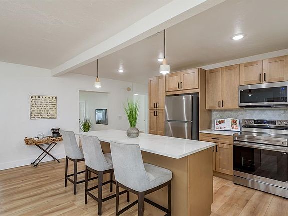 Sit-around center islandQuartz countersOpen designStone floorsBrand-new kitchenLight spacious feelStainless steel appliances