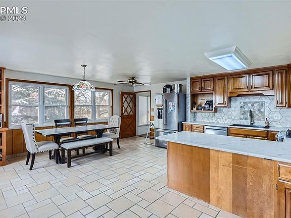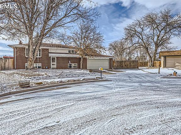 Looking for space - inside and out? Here you go! This 5 bedroom home has over 2000sf of living space AND is on an incredible .35 ACRE LOT at the back of a flat culdesac with Pikes Peak views! Delightful open floor plan with large eat-in kitchen * Updated kitchen with new Quartz countertops, striking custom tile backsplash, gas range, new microwave & fridge * TONS of counter and cabinet space * Charming full-height wood display cabinet in the kitchen * Adjacent living room with a brick fireplace that can be enjoyed from the living room and the kitchen * Two bedrooms on the main level with one having a separate entrance to the enclosed sunroom on the back of the home * Finished lower level with 3 additional bedrooms and a large walk-in cedar lined storage closet under the stairs * Updated vinyl windows * NEW Central AC (2023) * Updated electrical service (2022) * NEW water heater (2022) * Fully fenced backyard with separately fenced garden area * DOUBLE WIDE SIDE GATE for pulling trailer or equipment into the backyard * Expanded concrete patio * Not 1, not 2 but 3 sheds (1 is attacked to back of garage) in the back yard * * Pikes Peak views * Slip out the back gate for a peaceful walk on the trail * Flat cul-de-sac with fantastic Mountain views from the home and yard * Central location with easy access to military bases and Powers corridor * Close to schools, parks & shopping!