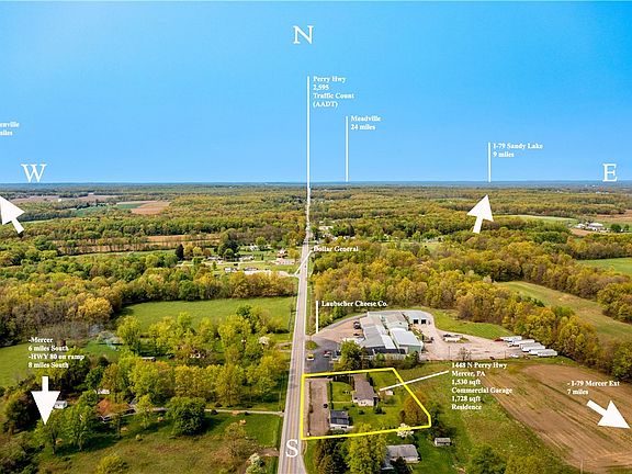 1,728 square foot residence with oversized (27x27) attached garage plus 1,530 commercial garage on Perry Highway apprx 6 miles north of Mercer. Well kept manufactured home built in 2000 on 1.37 acres in Lakeview School district features large kitchen, living, and dining rooms plus first floor laundry. Estimated traffic count 2,595 (AADT). No zoning in Fairview Township.