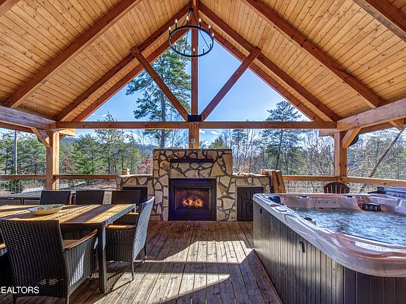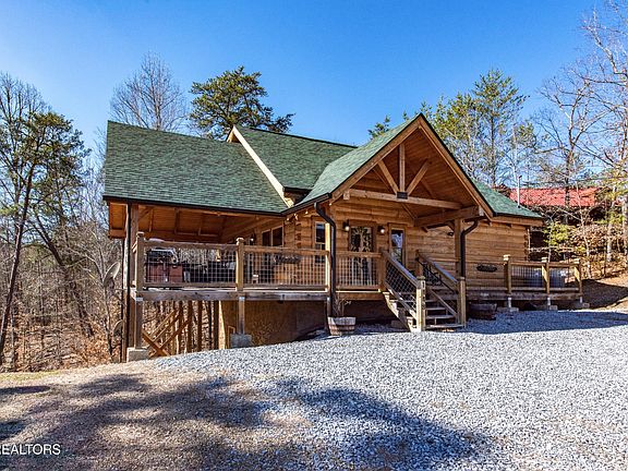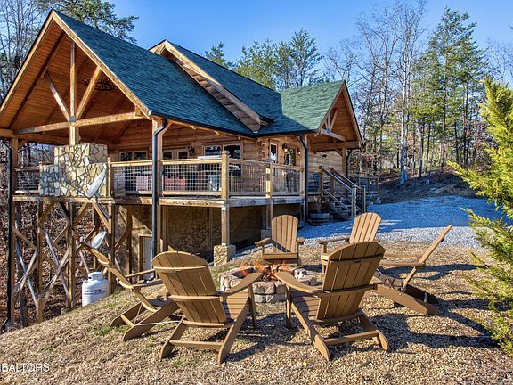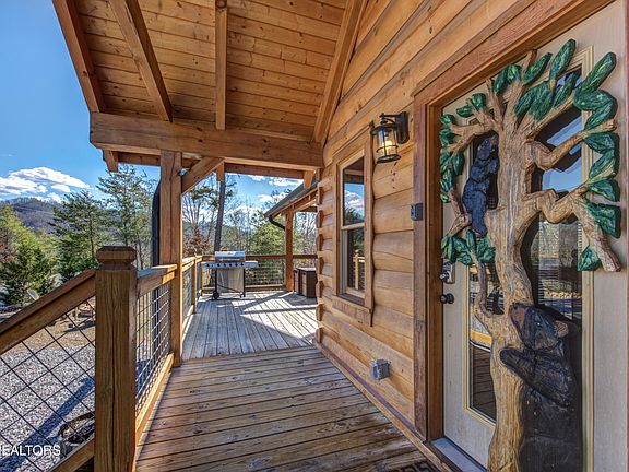 Built in 2021, this custom 3-bedroom, 2.5-bath true log cabin has lots of unique features. As you approach the cabin, you'll find a massive covered porch and outdoor living space with a large stone fireplace, a hot tub, and a gas grill. Inside is a spacious living room that flows seamlessly into the kitchen, which features granite countertops, stainless steel appliances, and shelving made from 300-year-old California redwood. The main floor also has two master suites, both with king beds and full bathrooms with custom tile walk-in showers, custom vanities, and granite countertops. The stairs are lined with laurel branches, which were harvested right from the property. Upstairs, there is a third bedroom/bonus room with a set of queen bunk beds, an 82' TV, a large sitting area, and a golf arcade game. Also upstairs, there is a game room with a pool table, a multicade game, and a half bathroom. You will love the peaceful mountain setting and privacy that this property offers, but it is also less than 20 minutes to Dollywood and to The Great Smoky Mountains National Park. The cabin comes fully furnished and turnkey! All items convey!