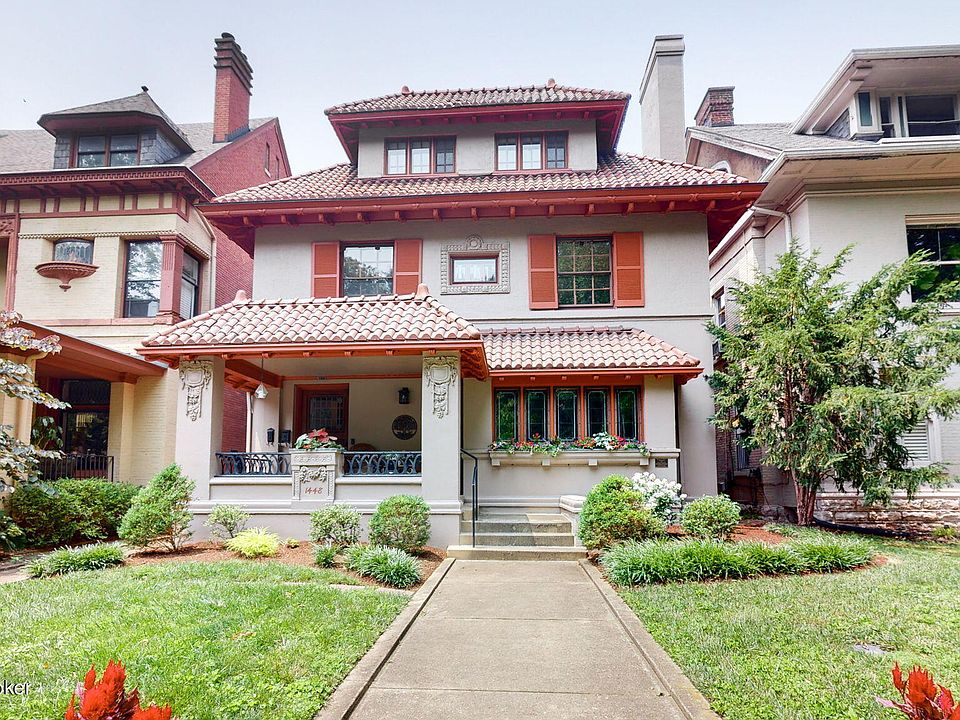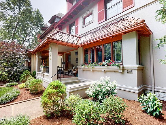 Not often does an opportunity such as this come along in one of Louisville's most historic and sought-after neighborhoods... This circa 1911 Arts & Crafts home on the National Register of Historic Places, was designed and constructed by prominent architect William J. Dodd and is located on the iconic Saint James Court in Old Louisville. The two-and-a-half story house offers 4385 Sq. Ft. of living space with 6 bedrooms and 3 1/2 baths. This architecturally significant Foursquare offers stucco exterior walls, red terracotta tile roofing, ornamental bracketed cornice, stucco planter boxes, and original stained & leaded glass windows. From the covered front porch, you will enter the home through a 4' wide by 8' tall front door into the grand entry foyer with a mahogany alcove and the ornate front staircase. To your right, you will find the formal living room with its sculptured, pressed plaster ornate ceiling & a Byzantine style marble working gas fireplace with blue and gold mosaic tile flanked by built-in cabinetry with leaded glass doors. The living room offers a broad wooden alcove overlooking the court. Behind the living room, you will find a banquet-sized dining room that connects to the butler's pantry with a handcrafted mahogany wet bar and cabinetry, with a wine cooler. The custom-designed kitchen (by Louisville's Architect, Ted Bressoud) was created for master chefs with an oversized center island, cherry cabinetry, Brazilian cherry hardwood flooring, a walk-in pantry, a 6 burner Viking stove with grill & griddle, double ovens (one with convection system), commercial Viking vent hood, warming drawer, double stainless sink and prep sink (both with disposals) and chevron tile backsplash. Just off the kitchen to the North is a conservatory/breakfast room with terracotta tile and floor-to-ceiling double-paned windows. There is also a powder room on this floor. Ascend the gorgeous front staircase or the rear staircase to the 2nd floor where you will find 3 large bedrooms, a primary suite, 2 bedrooms with a "jack & jill bath", and one small bedroom ideal for a nursery, study or exercise room. The original floor to ceiling linen press is in the hallway at the foot of the stairs to the third floor. The primary suite at the rear of the 2nd floor offers a private bath w/walk-in shower, ceramic tile floors, jetted tub, water closet, his-and-her vanities, and a laundry room. Up the rear stairs to the 3rd floor are 2 additional bedrooms, a fully equipped kitchen, custom bath and living room. The 3rd floor has been used as a rental for traveling nurses and makes a great guest space. There is an unfinished basement with 1050 Sq. Ft. for all your storage needs. The privacy-fenced rear yard is landscaped with stone and brick hardscape, a water feature and two garden spaces. There is a gas heated 888 Sq. Ft. 3-car detached garage (22' X 40') with an auto lift which provides an additional parking space or work area that has a ceiling height of over 12 feet. Our neighborhood offers the new children's playground in Central Park (Splash Pad Water area coming soon), Shakespeare in the Park, Free Concerts in the Park, Tennis Courts, The St. James Art Show, and many neighborhood amenities including formal and casual dining (Bucks Restaurant, 610 Magnolia, The Tavern Restaurant, and The Old Louisville Coffee Co-op). Come be part of this integral historic neighborhood.