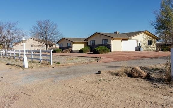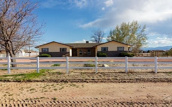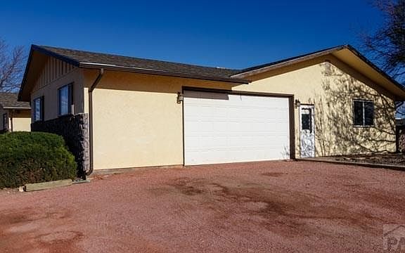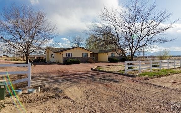 This 1971, 4 bedroom, 2 bath home features split rail vinyl fencing around some of the 1.48 acre property. Circular driveway leads you to the stone entry/sitting area. Formal dining area has laminate flooring, a window looking out to the entry and an opening looking into the kitchen. The kitchen has a L-shaped counter, tile floors, back splash,built-in desk/cabinet and opens to Living Room. The Living Room features vaulted ceilings, a wood burning fireplace with stone from ceiling to floor, 3 vertical windows to let in natural light in from outside. Master bedroom has a built-in shelving in closet and ceiling fan and bathroom has huge jetted tub surrounded by tile. Master bedroom has a door leading out to a covered patio with garden area, mature trees, grass, dog run and partial split rail fencing. There is a partially open cement/stucco building with windows and a porch with a door leaving to an area for horses or use for extra storage and it already has electricity and water is near by. (Septic pumped March, 2017). 2 1/2 car garage with shelving (freezer is excluded). Garage does not have a garage door opener, it opens manually. 2018 electric range oven. RV Parking and just minutes away from Lake Pueblo.