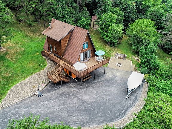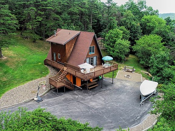 Very attractive, high quality chalet in one of Seven Points premier developments. Beautiful views from atop Piney Ridge from hillside 2 acre lot. 2 bedroom, 2 .5 bath chalet with detached 14x20 bunk house. Enjoy views from the large front deck. Stone fire pit. Finished basement. Mostly hardwood floors. Bunk house has a porch, electric and a loft. Very near Raystown Lake at Seven Points access area, Allegrippis Bike Trail, and State Game Lands. Large shed for additional storage. Being sold mostly furnished, and is ready for the new owner to enjoy.