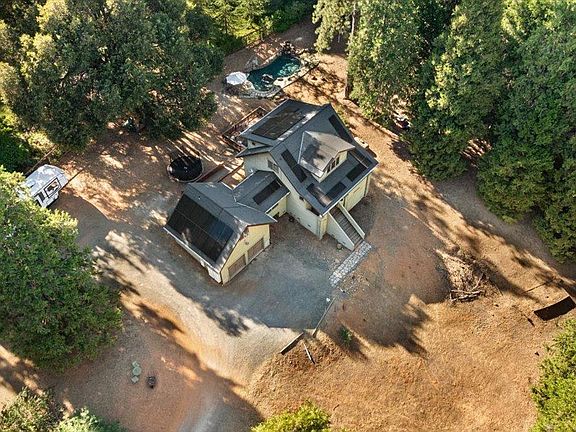 Custom Craftsman Retreat tucked away at the end of a private gated drive, this stunning home offers a timeless design on 2 sunny acres. Rich wood-clad windows, solid wood doors & copper gutters reflect quality craftsmanship, while full perimeter 6 ft. fencing provide peace of mind. The property features an inviting inground Pebble Tec pool, garden beds, and established apple trees, along with a circular driveway, large RV pad & finished storage room ideal for root or wine cellar. Inside, a formal wood-accented entry and dining room with hardwood floors set a warm tone. The living room with cozy gas fireplace opens through French doors to an expansive entertaining deck, while the tiled kitchen blends vintage charm with modern updates, including a new refrigerator that complements the antique O'Keefe & Merritt range. A cozy breakfast nook & breezeway retreat add to the home's function. The main floor also offers a large den useful as a 4th bedroom or home office. Upstairs primary suite offers sitting area & each bath offers clawfoot tub & shower. Add'l guest studio above the garage features private entrance, full bath, ideal for rental income. Energy efficient Sun Power solar system, generator hook-up, defensible clearing & commuter-convenience 10 min. to I-80 complete this home.
