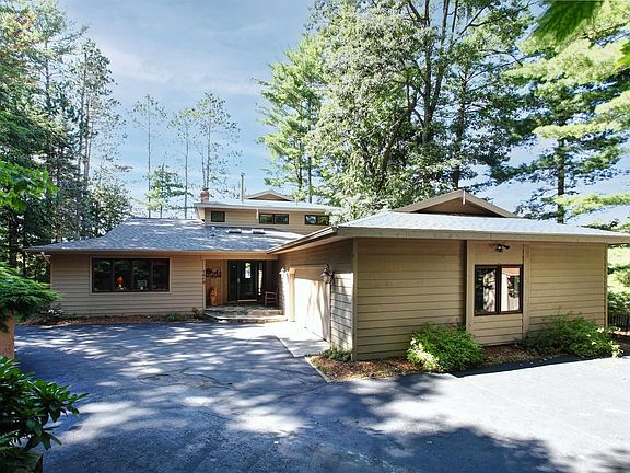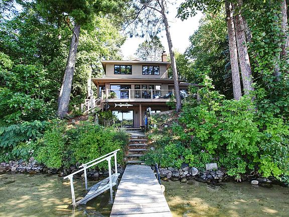One-of-a-kind Long Lake setting with some of the best frontage on the lake! Completely invisible from the road for the ultimate in privacy, a lighted circular drive leads through natural woods to this stunning contemporary home with pleasing lines and generously-sized spaces. Highlights include newer wood floors, a main-level primary suite with a private bath, walk-in closet, and slider doors to the back deck, a fireplace in the living room that is suitable for gas or wood use, granite counters and a breakfast bar in the kitchen, a second main level bedroom (currently used as a den), and a main level laundry room. Upstairs you'll find two more bedrooms, a full bath, and an accessory room perfect for many uses. The walkout level is finished with a family room, a 3/4 bath with a sauna (complete with a shower head IN the sauna!) a workshop, and storage room. Designed to maximize enjoyment of the waterfront, the rear of the home features generous windows to provide wide water views, the multi-level decking is ideal for entertaining (and features a power awning), and there are minimal steps to the waterfront with a rippled hard-sand bottom. The home sits 35' from the water, within the current waterfront setbacks and is grandfathered in - a newer home would never offer this kind of proximity to the gorgeous views of the water. The westerly exposure hosts sunset and island views, while the property's position on the lake provides both a protected cove and easy access to the wide water. Additional features include an oversized 2-car attached garage, an additional detached 4-car heated garage, central air conditioning, underground sprinklers, and a newer roof. This property is the complete package! Welcome to lake life!