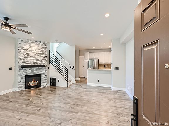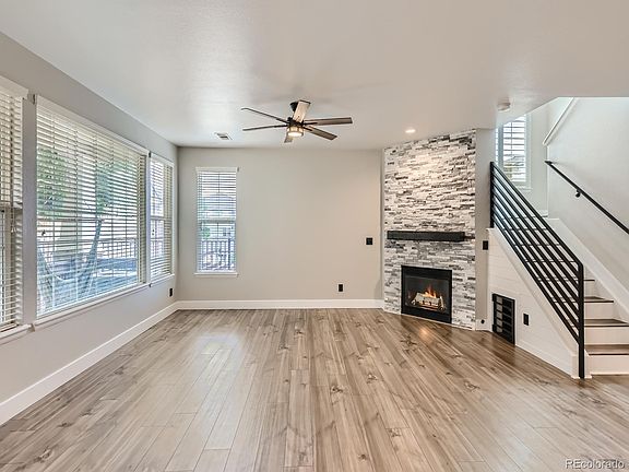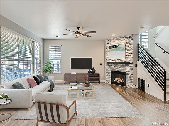 This end unit feels like a detached home with windows on 3 sides. Updated with an eye toward modern design, includes stacked stone fireplace, all easy clean flooring (no carpet), modern railings, remodeled powder bath, custom window coverings and shutters, and stainless appliances. Enters right into the kitchen from the attached 2 car garage with overhead storage. Main floor has a very open layout with high ceilings. All Bedrooms have vaulted ceilings. Primary Suite features a 5 piece bath with separate shower, soaking tub, and walk-in closet. Remodeled full hall bath, and spacious laundry room conveniently located on bedroom level. Covered front patio adjacent to a tree that provides shade and privacy. Convenient location to pool and hot tub. Close to all of the shopping, dining, and entertainment that Castle Rock offers, as well as golf courses and nature trails.