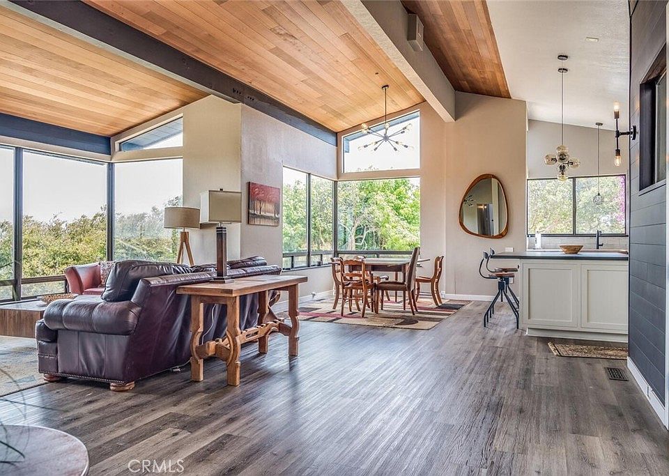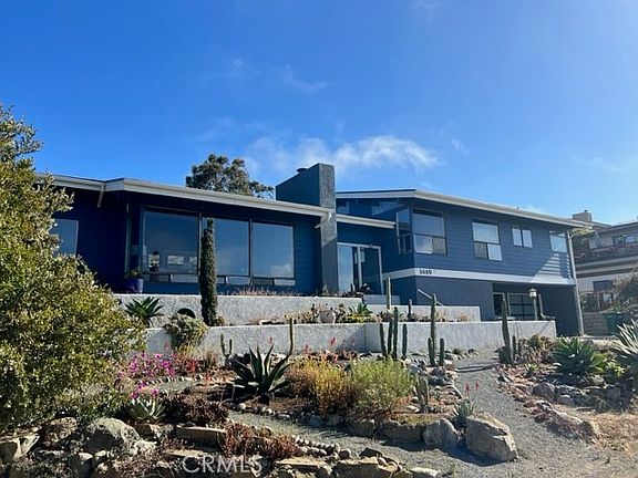 Midcentury architectural style split level home offers wide views from Morro Rock to Hollister Peak, with soaring redwood ceilings. Meticulously updated in 2022 with remodeled kitchen and bathrooms. Spacious 2 car garage Tesla car charger ready and separate private space for art studio or workshop. Beautiful paver fire pit for stargazing in the dark sky. Lovely Morro Rock views from the living room and master suite. See supplements for list of all upgrades.