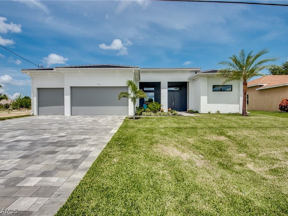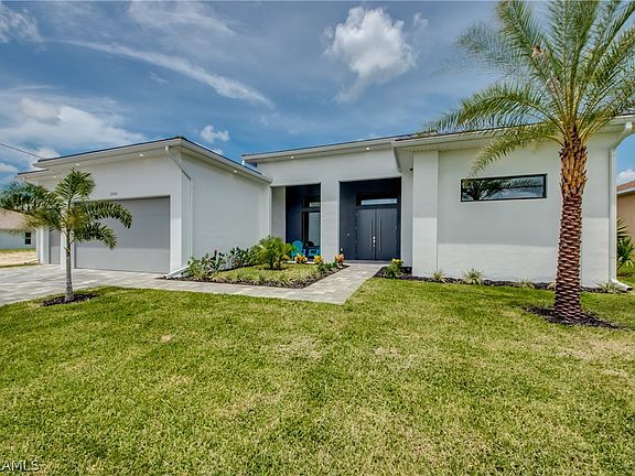 Check out this contemporary, currently under construction custom gulf-access canal home with heated pool and spa. This modern style home features 12' ceilings, 3 bedrooms, 2 bathrooms, a den/office, and 3 car garage! Huge amounts of custom upgrades like the 72" fireplace make this house stand out from the rest! Beautiful wood-like tile is featured throughout the home under its high ceilings. The kitchen is a modern masterpiece that's sure to attract plenty of attention. High-grade appliances including washer and dryer! The large kitchen island is perfect for cooking, baking, or entertaining friends and family. Pavered driveway and pool area make the exterior of the house look amazing and the modern flat style tile roof set it apart from the rest on the street. Located in the extremely desirable Yacht Club area of Cape Coral, this house is just minutes away from restaurants, shopping, the Yacht Club, Tarpon Point, and less than 5 minutes from Fort Myers! Brand new seawall!!! Impact windows!!! *Pictures are from sister house. Sister house has an identical floor plan.* Vacation rental company available to rent out the house for the new owners, if so desired.