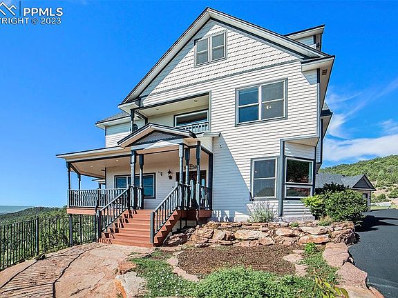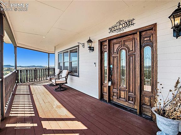 This crown jewel boasts 39 acres & 360' views of the entire Turkey Canyon. Enjoy breathtaking views of the Front Range foothills and the snowy peaks of the Sangre de Cristos and Spanish Peaks from one of the multiple decks. This property has access to Beaver Creek Wildlife Area, which encompasses over 28,000 acres of BLM land, and is perfect for any outdoor enthusiast. Thriving populations of local wildlife including turkey and hummingbirds frequent the area. Brand New A/C and water heater installed; the kitchen offers new cabinetry, granite countertops, & Bosch stainless steel appliances (JennAir cooktop); stunning hardwood floors, new light fixtures, plush carpet & fresh neutral paint throughout. Perfectly placed windows make each room in this home bright whilst showcasing its magnificent views! The main floor offers a 2 story entry through the custom door, a living room w/ corner windows, a formal dining room w/ French doors, crown molding, an elegant chandelier, and a lovely gas fireplace. The family room has a built-in mantel, cozy wood-burning fireplace, and a walk-out onto the covered wrapping deck which overlooks the entire valley. The main level also has a spacious laundry room, as well as a ¾ bathroom off the laundry room/garage entrance. Upstairs waits a vast master bedroom with adjoined sitting area, a 5pc bathroom, and a walk-in closet. This floor also offers 3 addtl spacious bedroom suites, each w/ private bathrooms featuring claw foot tubs. The lower level has a grand room hosting ceiling-mounted speakers, a high-end theater-style projector, & a 10-foot screen placed on an elevated fabulous stage. The lower level also has a secondary kitchen and a custom architecturally designed bright and sunny walkout dining room. This level also provides 2 private suites. Each has a ¾ bathroom with amazingly crafted tile work and walk-in showers. Minutes to Fort Carson and Cheyenne Mountain State Park, this majestic mountaintop home awaits!