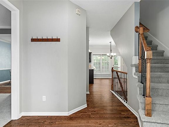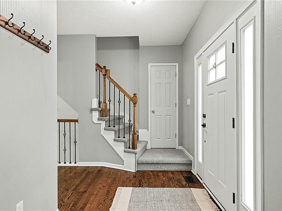 Step into this exquisite two-story home with a stunning fusion of elegance and comfort. Freshly expanded and refinished hardwood and plush carpet welcome you inside. Immerse yourself in nature as the home gracefully backs to trees, creating a serene atmosphere. With four bedrooms in total and two full and one half baths, there's ample space for family and guests. The kitchen, an epitome of sophistication, showcases new quartz countertops, a tasteful tile backsplash, and a modern touchless faucet. The cabinets have been expertly refinished to exude a warm espresso tone that harmoniously blends with the home. Indulge in the luxury of a massive primary bedroom adorned with gleaming hardwood floors and a custom ensuite closet. The ensuite bathroom has a separate shower, large tub, and a private water closet and boasts separate vanities, giving ample space. Entertainment reaches new heights in the finished basement, featuring a built-in surround sound system and plumbing for a future bathroom if desired, offering even more possibilities for customization. Embrace outdoor fun with a regulation corn hole pit and a gas grill with a direct line, making grilling sessions a breeze. Nestled in the renowned Blue Valley School District, this remarkable home offers comfort and elegance. Discover your dream sanctuary, a perfect blend of warmth, comfort, and serenity. Don't miss this rare opportunity to make it yours!