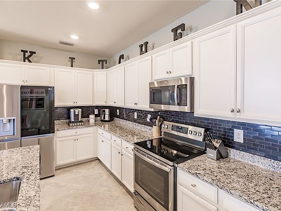~~ASSUMABLE MORTGAGE AVAILABLE WITH A 2.25% INTEREST RATE!!!!BETTER THAN NEW CONSTRUCTION! Unlock sleek and functional living in this updated 3 bed/ 3bath Venice model by Lennar located in the resort style community of Portico. This home offers many upgrades that include new lighting fixtures throughout kitchen and outdoor areas, a beautiful subway tile custom backsplash in the kitchen, granite countertops, upgraded appliances that include a smart refrigerator, organizational shelving/drawers built in to both primary and guest bedroom closets, and a fenced backyard perfect for pets or little ones! Another bonus is the laundry room has added cabinetry and shelving really making it a great organized space. The home is located in the first phase of this master-planned community so it is only a short walk to activities, mailbox and amenity center/pool. Portico is part of the Fort Myers Shores River district but the community is Flood Zone X, so no flood insurance needed! Call and schedule your showing today!