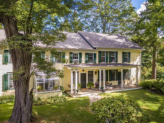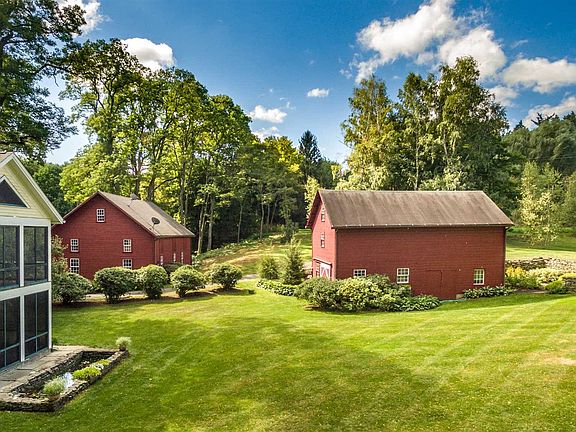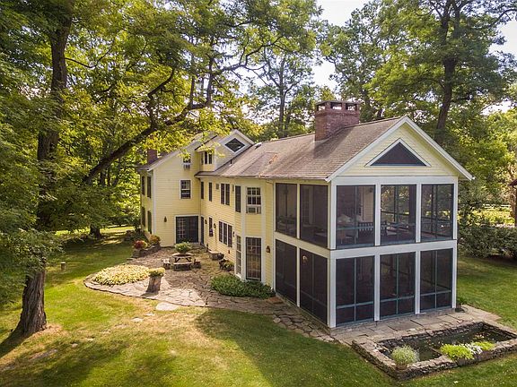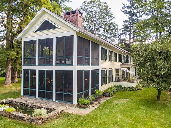 This brilliantly refined 1840 house is a fine example of the Greek Revival building style. The original house has been expanded, but with great care to maintain the original integrity of the period. It is spectacularly set on 55 acres comprised of expansive meadows, a pond, orchards, and lightly wooded acreage. The main (4000+ square foot) house has spacious, perfectly proportioned rooms, wide-board flooring, large windows allowing lots of natural light, and high ceilings. The formal living room features a fireplace and French doors that access the stone terrace spanning one side of the house. The grand dining room has a door to the covered entry porch on the other side of the house. The kitchen, equipped for the serious cook, maintains an authentic feel with antique beamed ceilings, farmers sink and open shelving. It has a pantry, three sinks, center island and 6 burner Wolf Range. The kitchen opens to the sunny family room that has space for dining and sitting. Its fireplace is flanked by doors that access the screened-in porch with a fireplace. Also off the kitchen is a delightful garden room/greenhouse where one can grow fresh herbs and flowers year round. On the second level are three bedrooms and a 2-room office. The master suite has walk-in closets, a bath with soaking tub and separate shower, window seat, and a fireplace which is flanked by doors to the screened-in sleeping porch. The porch has splendid views of the grounds, including the gunite pool and gardens. One of the bedrooms has a wood stove and bath en suite. There is also a full bath and laundry room conveniently located on this level. The finished 3rd level has two large rooms used currently as a home office. Beyond the main house are several other buildings - a two bedroom guest house with kitchen, bath and screened porch; a studio with an indoor endless lap pool; two barns, one with horse stalls, the other, closer to the house, is used as a garage. As well, on a separate parcel is a 2-bedroom guesthouse that overlooks the pond. The acreage is magnificent with lovely mix of open fields and forest. In addition, the property abuts Nature Conservatory land, a refuge for many migratory birds.