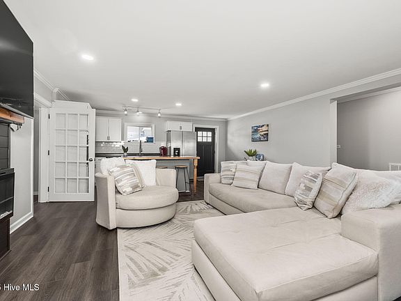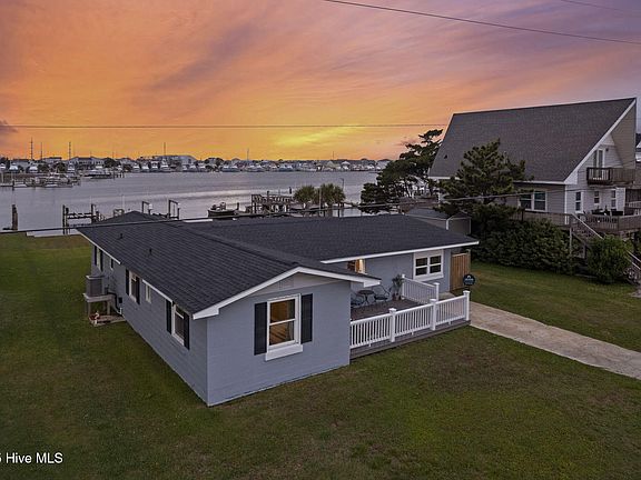 This beautifully updated canalfront home features 3 bedrooms, 3 full bathrooms, a sunroom, and a versatile office with closet, currently outfitted with bunk beds. Ideal for boating enthusiasts and beachgoers alike, the property includes a private dock with a lift and an outdoor shower, perfect for rinsing off after a day on the water. Inside, wide plank LVP flooring flows throughout the home, complementing the stylish, updated kitchen featuring white cabinets, granite countertops, a tile backsplash, and stainless steel appliances. The kitchen island, topped with a warm wood block, creates an inviting space for entertaining and connects easily to the open living area. A cozy electric fireplace anchors the living room, which extends into the light-filled waterfront sunroom and out to the patio for seamless indoor-outdoor living. The primary bedroom includes a beautifully updated ensuite bath, while two additional bedrooms and guest bathrooms—one with laundry—offer comfort and convenience. With easy access to Bogue Sound and the Intracoastal Waterway, this home is a perfect coastal retreat. Whether you're seeking adventure, relaxation, or a bit of both, this retreat offers the perfect coastal escape for everyone.