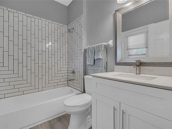 This fully renovated, 4 bdrm, 3 bath house in Bridge View community is better than new! Spacious and bright, open concept floor plan with gorgeous laminate floors throughout invites you into an entertainers dream.The BRAND-NEW roof add to the homes efficiency. The magnificent Kitchen with Quartz counter tops, cabinets with soft close and new Stainless Steel appliances is ready for any chef. The kitchen flows into the Dining room and Great rooms. Relax in the Master bedroom with walk-in closet, free standing tub and enjoy the stunning spa-inspired Master bathroom with large shower, double vanity and beautiful tile throughout. The second bedroom is perfect for guests or office with a bathroom nearby. The third bedroom is located near the third bathroom, great for guests. The laundry room is conveniently located. Enjoy the inviting screened-in, all tile floor porch. This wonderful house is in a great community with a lot of amenities and close to Disney, shopping, and other major attractions. Ready to move in and a great opportunity for any investor.