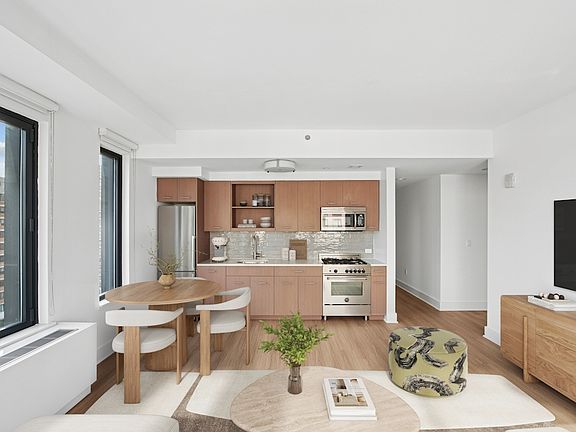 The building comes fully equipped with first-class amenities including an attended lobby, concierge service, a residents lounge with billiards and shuffleboard tables, a reservable private dining space and meeting room, TV lounge, built in banquette, and work stations. Outdoor spaces feature a rooftop terrace lounge seating throughout, dining tables, grills, and sweeping views of Manhattan. Additional outdoor space includes a residents elevated garden terrace and a public landscaped plaza just outside the lobby. The fully equipped state-of-the-art fitness center features Peloton bikes, a Wellbeats studio with on-demand fitness classes, and Activ Virtual Personal Trainer. The building is also pet friendly and features a pet spa, along with a childrens playroom and bicycle storage.