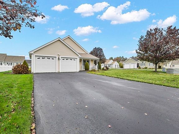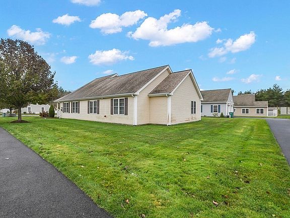 Welcome home to the quiet & private community of Berry Hill: an over 55 plus community! Enter your new home through the front entrance (with a front porch area) and enjoy the open concept living space featuring the large living room with vaulted ceiings, dining area and kitchen complete with a large island. Kitchen features beautiful dark wood cabinets with tile flooring. Off of the kitchen is access to your side patio space, perfect for those morning coffees. Also off of the front entrace is access to your spacious garage which holds the homes main utilities and storage space. Head back inside and down the hallway to two bedrooms with their common hallway bathroom and the primary bedroom which has its own full bathroom as well. Primary bedroom also has a walk in closet! Home comes with a generator for those stormy New England days! Come check out this beautiful Berry Hill home today!