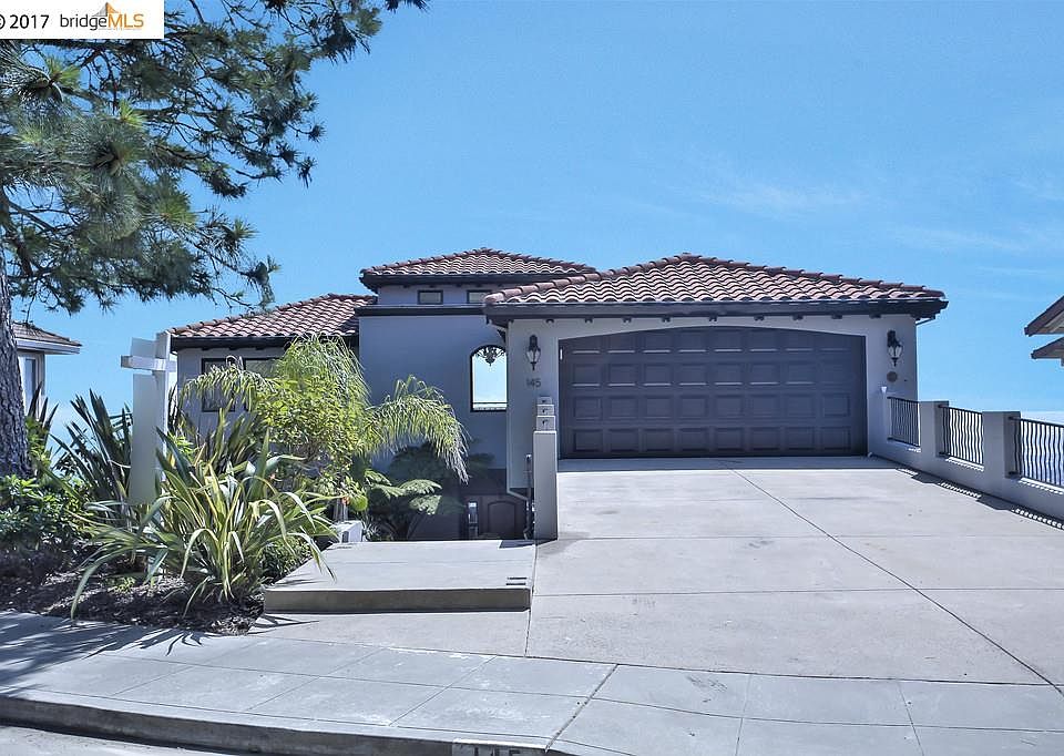 A 5 bedroom, 4.5 bath Oakland Hills home with beautiful custom features and finishes. Enter through the front courtyard with tranquil fountain, 3-bridge views of the bay area on every level, formal living and family rooms with fireplaces, formal dining room, library and chef's kitchen with stainless steel appliances. A curved, wrought iron staircase leads from the main level to top-floor garage access, as well as two additional bedrooms and a full bath. On the lower level, three bedrooms include the beautifully appointed master suite with fireplace, private balcony, and fully appointed custom bath and closet. The lowest level includes rooms suitable for a private in-law suite.
