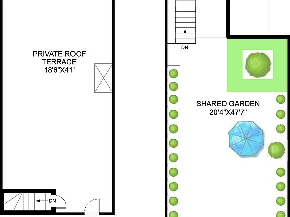 The expansive private terrace is perfect for rooftop gardening, bbq'ing, entertaining plus offers panoramic vistas of both Brooklyn, Manhattan and the Statue of Liberty. It is worth noting that the vantage point on the 4th of July is spectacular! Residents also have access to a shared garden space, enhancing the sense of community and tranquility. The shared garden is infrequently used by other tenants and has a grill, outdoor furniture, a fire pit, bamboo, roses, hydrangeas and lots of other beautiful flowers. Having two outdoor spaces is truly an added bonus!