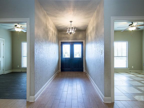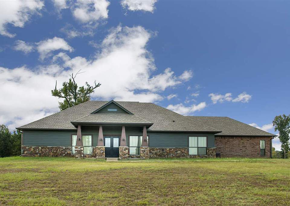 Tucked away in a quiet, captivating wooded setting, this stunning Ranch sits on 5.040 acres and a water view of the lake, is attractive and custom built in Deerfields Farms! Located in Hallsville ISD. You will notice the attention to details when you walk in through the lovely double wood doors. Nice flooring, stainless steel appliances, granite throughout, built-in entertainment system, nice sized split primary suite and two oversized bedrooms. One bedroom is equipped with a half bath, cabinets and a sink; could easily be turned into a mother-in-law suite or used for entertaining! 400 sqft patio to enjoy your acreage! Generator and tank installed to run the whole house for 8 days. Three-sided structure located at the back of the property utilized for parking equipment.