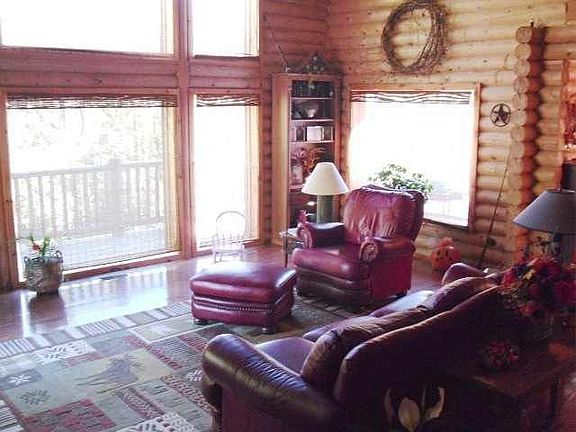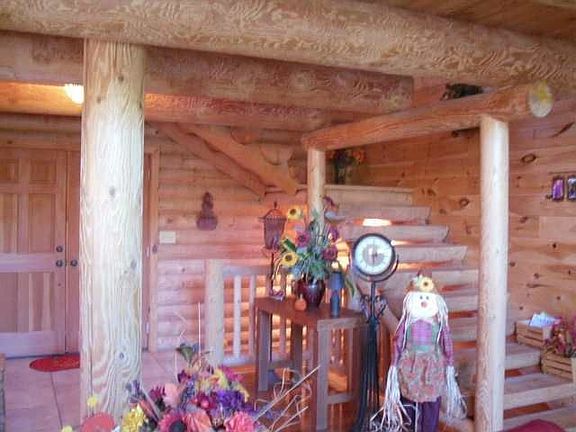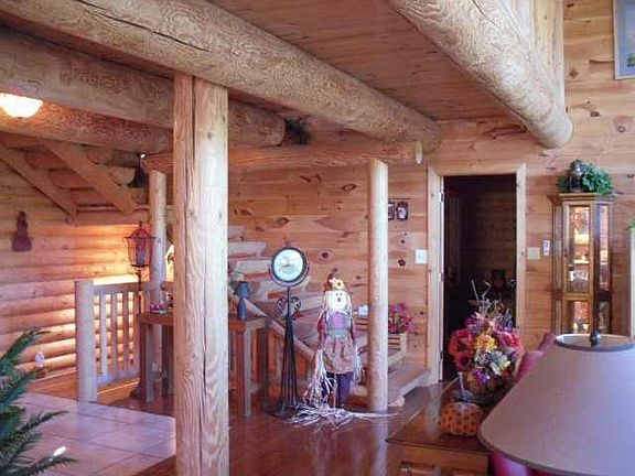 Beautiful rustic log home with large living room with huge open beams. Gorgeous red oak flooring and a sitting loft area, spacious kitchen with pantry, large workshop in basement, plus bonus room for storage for all your seasonal decorations. There is a pellet stove in living room. Basement needs a little finishing touches such as flooring, but is full basement with lots to offer. Home as a large covered front porch and deck for entertaining. Close to White River, has all city utilities.