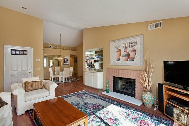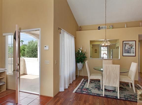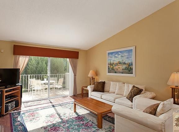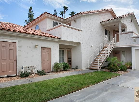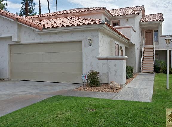 Not near Cook or Country Club. Clean and quiet unit. 2 bedrooms/2 bathrooms plus laundry room. One level, upper lever, end unit. Furnished per inventory. This condo has two balconies: an eastern exposure balcony with partial mountain view off the kitchen - perfect for your morning cup of coffee - and a western exposure balcony with partial mountain view off the living room - perfect for that end of day glass of wine while watching the sunset. Living room features cathedral ceiling, fireplace and wet bar. Wood laminate floor in living/dining and hall. Wall-to-wall in bedrooms. Tile in kitchen, baths and laundry. Double garage. Close to pool and clubhouse. HOA only $471 per month. Desert Falls is centrally located and close to everything the desert has to offer.