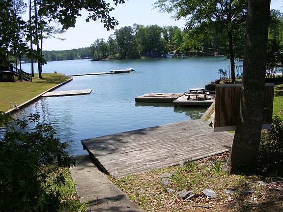 LAKE MARTIN waterfront home on a flat lot.. 2 B/R 2 bath downstairs with large bedroom/bonus room upstairs (currently has 2 queen and one single beds). Large walk-in closet in MBR, large utility room off Kitchen. Front porch overlooks deck, pier and floating dock.