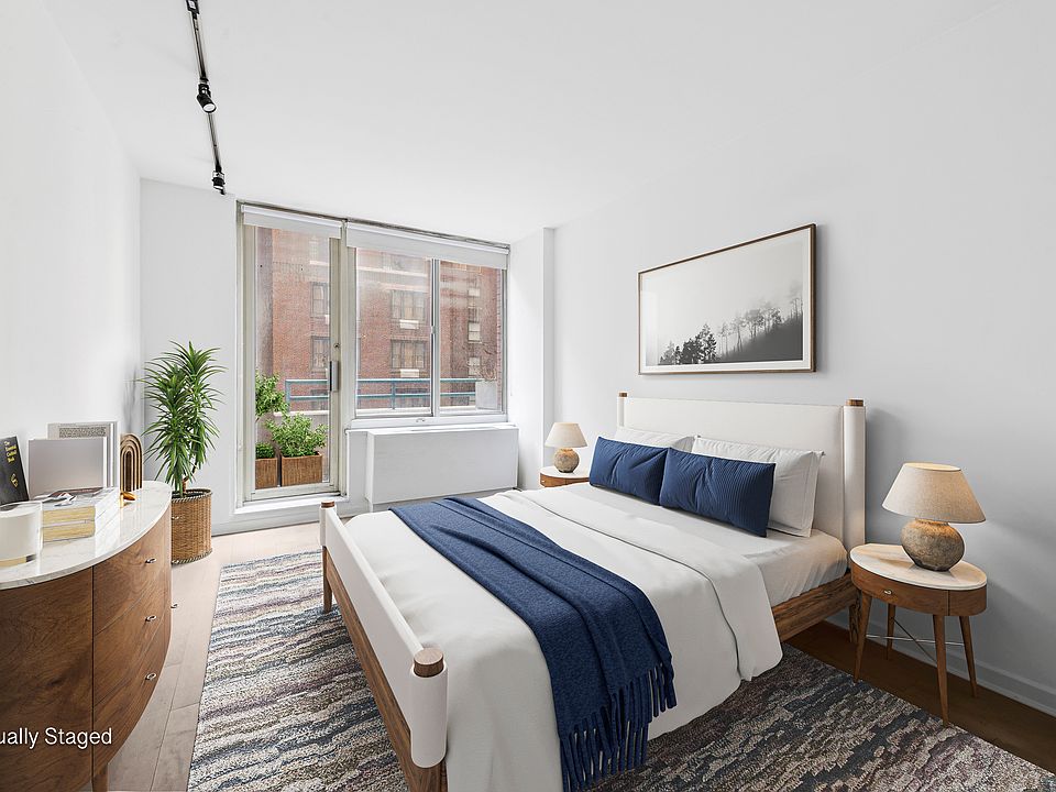 A renovated one-bedroom with real space and a private terrace, two blocks from Grand Central. Residence 7E measures approximately 650 square feet and features a large living room with a south-facing bay window, a defined dining area, and a king-sized bedroom that opens directly to the terrace. The kitchen includes brand new full-size stainless steel appliances with dishwasher and microwave. The bathroom was just renovated with clean, modern finishes. Wood floors and through-wall air conditioning complete the interiors. The Cosmopolitan is a full-service condominium with 24-hour doorman, concierge, resident manager, roof deck, on-site garage, and laundry facilities. Available now.