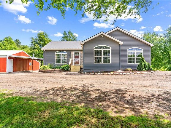 Live in pure serenity in this open-concept 2009 build ranch home on 5 acres! Desirable floor plan offering versatile living opportunities. Appealing touches with rough-cut cedar shake accents and a new custom front porch. Beautifully landscaped with fresh mulch, lilies, hostas, roses, and morning glories. Enjoy the convenience of a 1st-floor laundry/mud room, apartment-style basement, pole barn and so much more! New flooring and