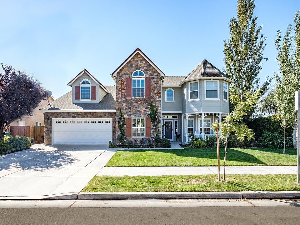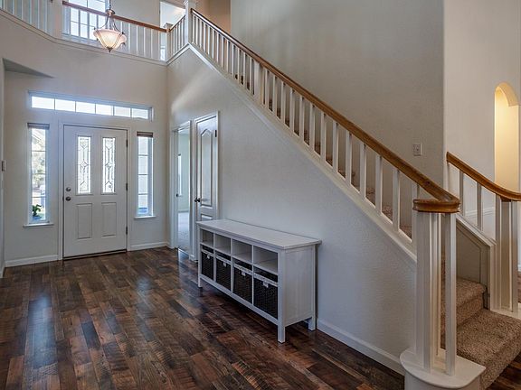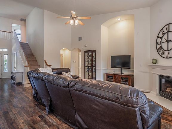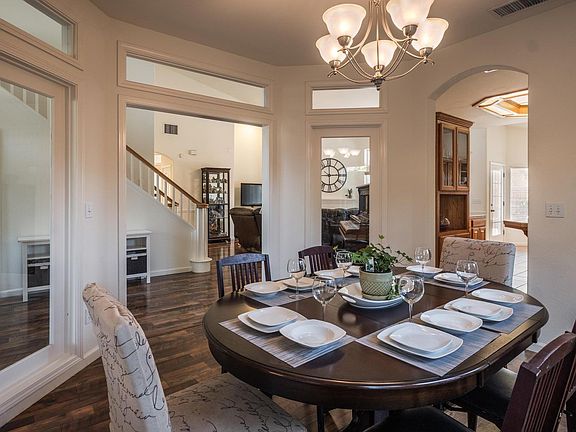 Wow! This 5 bedroom/3 bathroom two-story home is a must see. New hardwood floors adorn the downstairs hallways, living room, formal dining room, and master suite. The beautiful entryway and living room feature vaulted ceilings and are open to the upstairs. The exquisite master suite also has vaulted ceilings, and it includes a sitting room (which can double as a home office), a large walk-in closet, and a master bathroom. Separate walk-in shower, dual sinks, and a large soaking tub complete the master bath. In the kitchen, tile countertops, a large island, and a custom built-in desk are included. The first two bedrooms are located off the main entryway, and the master suite is off the living room. Upstairs you can find a large loft, two additional bedrooms, and a full bathroom with dual sinks and a shower/tub combo. The backyard is perfect for entertaining. It has a large covered patio, a Mediterranean courtyard design with plenty of greenery, and a gorgeous pergola.