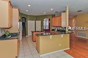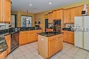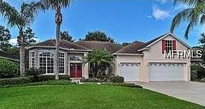 This five bedroom three bath home has a formal living, dining(with high tray ceiling), and family room. The island kitchen has maple cabinets with 42 inch uppers with crown molding and granite counter tops. The raised counter top will accommodate bar stool seating. Built-in oven and microwave. The cook top is separate. The adorable breakfast nook over looks the family room that has a wood burning fireplace finished in stone. Stainless steel appliances and double sinks. The master suite is very private and also has a fireplace! The very large master bath has separate dual vanities with cultured marble counter tops. Garden tub and separate shower. All the auxiliary bedrooms are quite large. This home is in very good condition. High ceilings. Blinds, window treatments, hardwood floors, and tile throughout. The lanai has a built-in heated spa. THREE car garage. Beautiful elevation and nicely landscaped. Gated community.