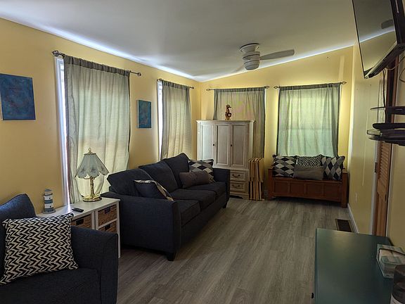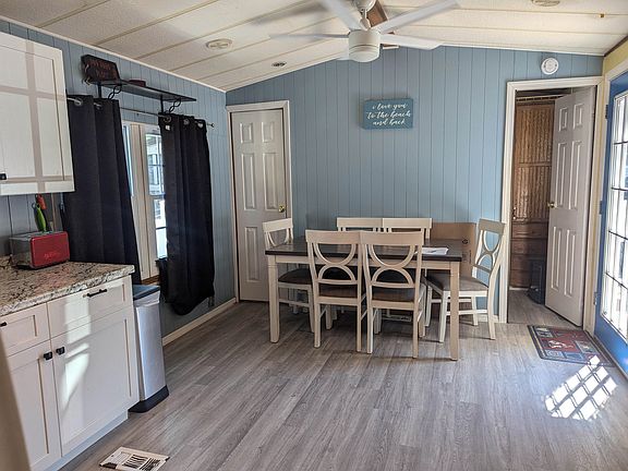 This fantastic unit was upgraded in 2020, featuring new plumbing, electrical systems, ceilings, and walls. It boasts an open kitchen and a spacious dining area. The unit includes a large bunk room with a double bed on both top and bottom. A newer half bath accommodates the overflow of guests. The primary bedroom offers ample built-in storage. A large Florida room contains two queen sleeper sofas and abundant space. This unit is furnished with a few exceptions. Outside, there is a sizable Trex deck with new railings, alongside a concrete parking pad and shed.