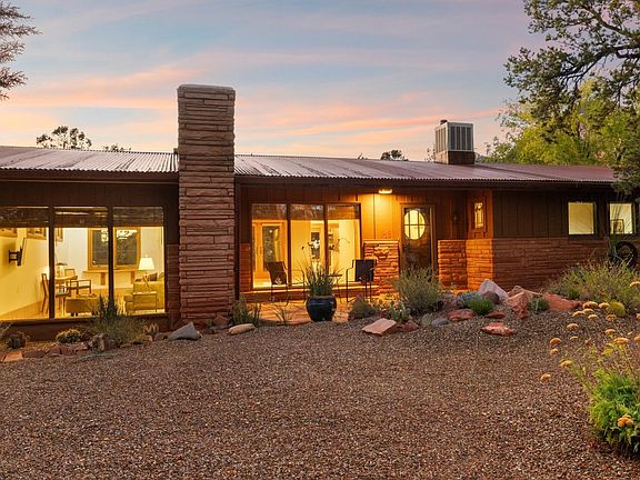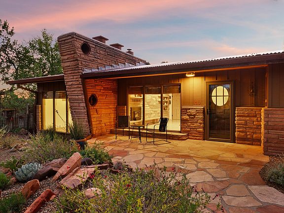 This midcentury modern home stands as a rare fusion of architecture, artistry, and soul, and is artfully called the House of Stone and Light. Originally built in 1961, inspired by Frank Lloyd Wright and infused with the tranquil essence of Shangri-La, this residence blends sustainability, craftsmanship, and history into one timeless masterpiece. Set on over one-third acre at the end of a cul-de-sac, this property embraces Red Rock vistas and gorgeous sunsets while remaining close to hiking and biking trails, and minutes from the bustle, galleries, and charm of West Sedona. With no Hoa, opportunities truly present themselves at this architectural gem including 2 separate buildings. Main four-bedroom residence with 2 bathrooms is a delight at 1,762 sq. ft., and has been extensively remodeled from 1998 through 2025, with every surface touched and thoughtfully renewed. Designed to live in harmony with its surroundings, some of the upgrades include dual-pane high-E Andersen windows, solid Alder doors, solar tubes, French doors and sliders that spill out onto back yard cement stained patios, flagstone pathways, trellised iron rusted gates, and whimsical artistry and includes two outbuildings! Wow! Exterior main home boasts a unique horizontal Bric Brac patterned flagstone, and pine soffits highlighting the meticulous design including 2 circular chimney sphere dotted with metal art work, all beneath a corrugated Corten steel roof accented by hand-wrapped Corten gutters. The main living area is stunning boasting wood beamed ceilings, with the exterior flagstone work following through into a full wall to wall flagstone wall framing a wood burning insert feature, built-in stone shelving, with the sacred Thunderbird symbol craved into the stone work, anchoring the room with artistic resonance. That symbol or the kachina is found on the stone exterior and rock walls too! Open concept main living area features a kitchen with a Wolf range, handcrafted maple cabinetry with a center island, topped with volcanic Corian countertops flecked with natural red minerals, a farmhouse-style Kohler undermount sink, walk-in pantry, updated stainless-steel appliancesincluding the refrigerator, washer, and dishwasher replaced in 2025, and a breakfast high counter top make the kitchen as practical as it is beautiful. Every corner celebrates artisan craftsmanship and historic soul: