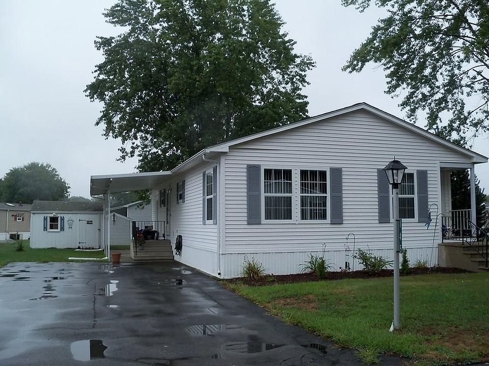 Big Bright and cheery. Rocky Knoll Estates, a 55+ community. This double wide home sits on a corner lot and has a 4 car driveway and a covered porch area. The Roof, AC and hot water heater new in 2017. Park Fee includes water, sewer, taxes, trash and street plowing. Owner is responsible for their driveway and walkway snow removal and lawn maintenance.