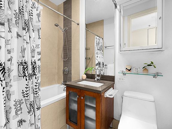 Step inside and be captivated by the sleek and contemporary design, over 10 ft ceilings, floor to ceiling windows, thoughtful open floor plan and solid Brazilian teak hardwood flooring throughout. The living area flows seamlessly into the gourmet kitchen equipped with top-of-the-line stainless steel appliances, granite countertops, ample cabinet space, convenient breakfast bar seating, and space for a dining table too! Unit 2A offers an abundance of natural light flowing in from the floor to ceiling windows and french doors leading out to the Juliette balcony adjacent to the living room. The king sized bedroom not only has a spacious closet, but also has a full wall of built-in custom closets and custom bottom up shades for added privacy. Convenience is key, and this second floor residence includes an in-unit washer/dryer, voice intercom, HVAC, and an alcove home office with a removable pressure wall for the perfect work from home set up. There is also a furnished common roof deck with panoramic views of the Manhattan skyline.