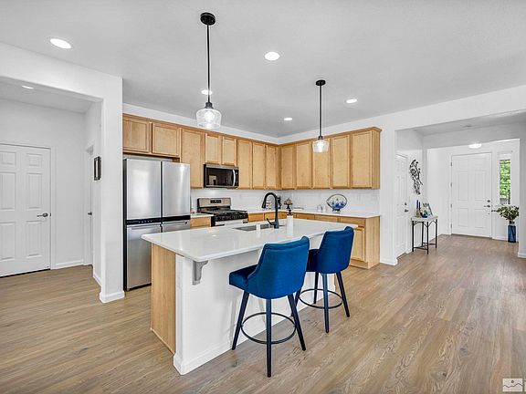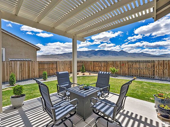 Welcome to this tastefully updated 3-bedroom, 2-bathroom home with a versatile office/den, nestled in the desirable gated community of Dayton Valley Golf Course. Situated on a unique lot, this home offers peace, privacy, and expansive mountain views right from your living spaces.Step inside to find a modern, move-in-ready interior featuring NEW luxury vinyl plank flooring (22 mil) throughout and NEW paint on all walls, ceilings, baseboards, doors, and trim. The kitchen has been completely refreshed with, quartz countertops, tile backsplash, a new sink and faucet, updated pendant lighting, and brand-new stainless steel appliances—a perfect blend of function and style. Both bathrooms include new toilets, water and light fixtures, and the primary suite offers a spa-like experience with a large walk-in shower, separate soaking tub, dual-sink vanity, and a walk-in closet. Enjoy serene mountain views right from your primary bedroom window. The FULLY INSULATED garage has been finished with new paint, ceiling-mounted LED lighting, cabinets, and countertop space—ideal for storage or projects. Step outside to a covered back patio with full landscaping and wide open views of the surrounding natural beauty. Whether you're entertaining or unwinding at the end of the day, the outdoor space is a true retreat. All of this is located in a secure, gated community with access to the Dayton Valley Golf Course, offering a lifestyle of leisure, beauty, and comfort.