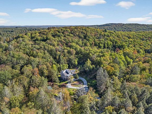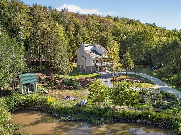 Quality home, 4.7 pristine acres, cul-de-sac road. Cathedral ceilings and skylights offer ample natural light. White oak flooring and recessed lighting throughout. Large elevated deck with view of swimmable pond. Master suite includes walk-in closet and bath with jacuzzi tub. Two beds, full bath & living area on second level. Heat with 8-zone system incl. radiant floors, or with high efficiency wood stove. Walkout basement offers finished rec room, laundry room with infrared sauna, and utility room. Basement not included in square footage, offering extra space. Plus • Whole house water filtration system • Ample indoor storage • Storage sheds, woodsheds, chicken coop • Fenced dog run • Permaculture gardens with fruit & nut trees, berry bushes, herbs & flowers Optional tiny house available including kitchen, shower & enclosed septic - not included in list price. 15 min from charming Ellenville, Mountaindale & Hurleyville. Enjoy state parks & ski slopes. 2.5 hours from NYC.