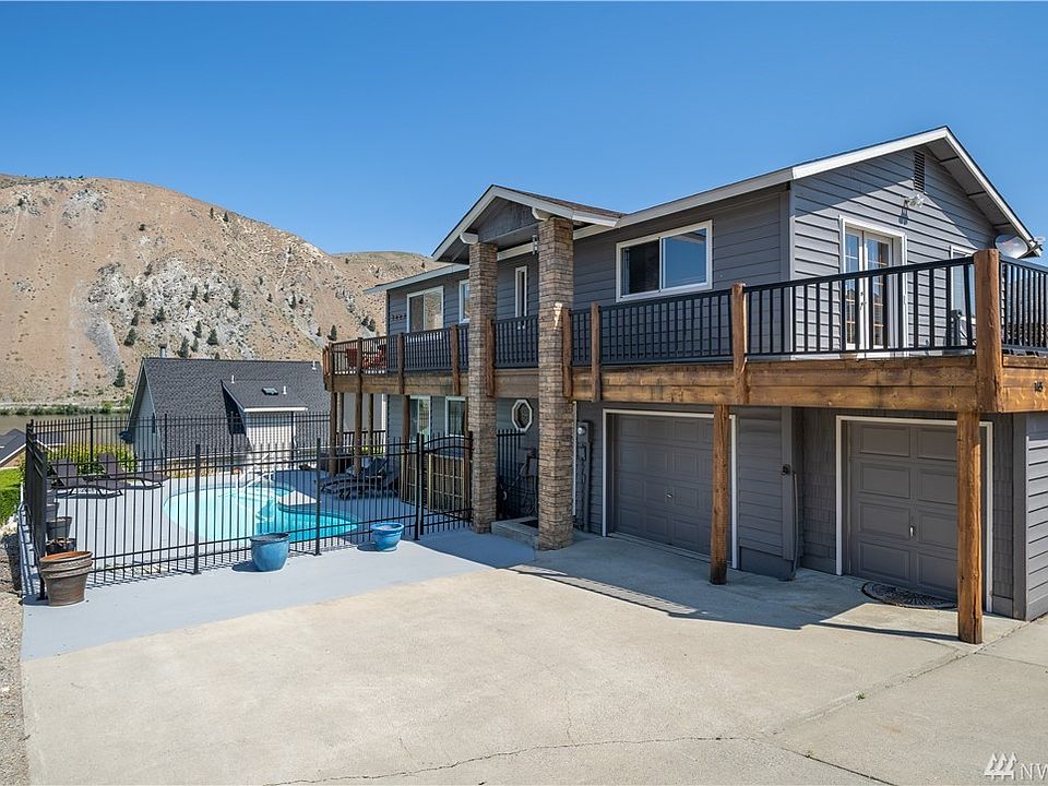 Sun Cove Community Waterfront home with 3 bedrooms, 2 baths. Open living room & kitchen. 2 bedrooms, one being master on the main level. Third is downstairs along with extra sleeping space & kitchenette perfect for guests. Large wrap around deck to take in the river & mountain views. Private swimming pool & all the amenities of Sun Cove; boat launch, 3 marinas, clubhouse, community pool, and sports courts to enjoy. Garage plus golf cart parking, and lots of additional street parking for guests.