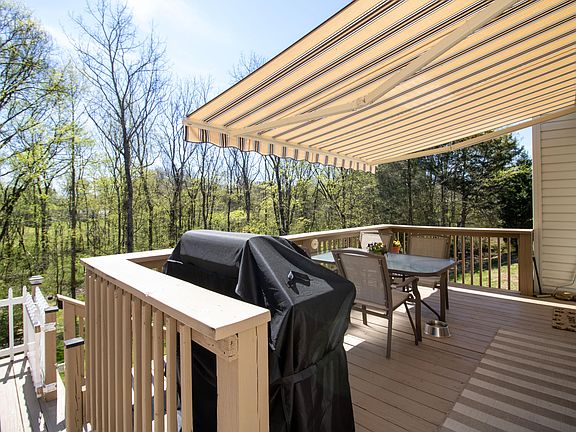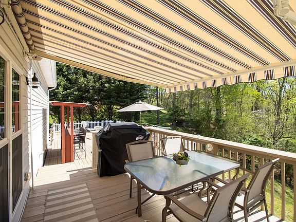 The outdoor space is perfect for entertaining guests or enjoying the tranquil surroundings. A deck with an outdoor bar and electric roll-up awning with lights provides a perfect place to enjoy a summer evening. The 1.09-acre lot includes a seasonal creek and is surrounded by well-maintained landscaping and lawn.