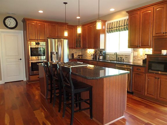 - Kitchen Features: Wood Cabinets, Island, Wood Floors, Gourmet, Pantry, Eat-In, Marble/Granite/Slate, Walkout