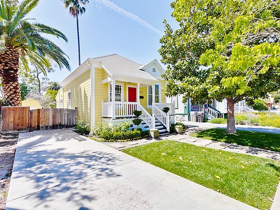 Sunny home with high curb appeal & front porch entry into stunning living room with wood & wood-beamed ceiling, found throughout main floor. First floor primary bedroom with walk-in closet accesses recently-renovated full bathroom with Calacatta Nuvo herringbone tile floor, step-in dual-head shower with bench, shiplap walls, & dual Carrara marble vanity. Second floor loft bedroom with large skylight, walk-in closet, office nook, & attic access. Large kitchen with moveable island, stainless steel appliances including gas range, white cabinets, tile counters, beadboard backsplash, & breakfast nook open-concept with dining room. Oversized laundry room with storage. Deep, fenced backyard features brick patio, fruit trees, barn-style storage shed, & room for potential home expansion. Extended driveway fits multiple cars. Very near many shopping, dining, and entertainment options plus San Jose State & major commuting routes 101, 280, and 880.