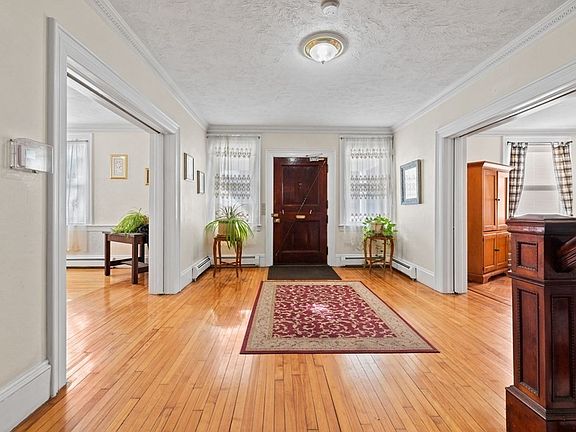 ATTLEBORO - Historic charm abounds in this 6 bed, 2.5 bath sprawling home near Attleboro's Colonel Blackinton Inn, with easy access to shopping, schools, and Rts 95+495. Intricate dentil moulding, original hardwoods and sky-high ceilings throughout, plus two beautiful sets of pocket doors to separate both living and dining rooms from the oversized foyer. Extra-wide main staircase leads up to 2nd floor featuring 5 bedrooms and 2 full baths; back staircase returns to main level and additional bedroom w/XL fireplace. Updates include indirect water heater w/expansion tank, Energy Star Alpine gas boiler, replacement windows and insulation throughout. Walkup attic holds possibilities for finishing approx. 800 additional sq ft.
