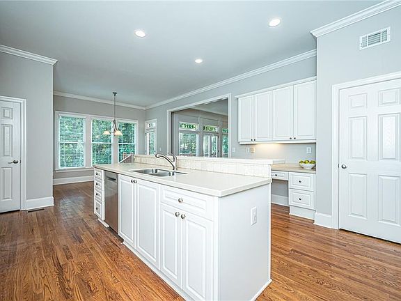 - Kitchen Features: Breakfast Bar, Pantry, View to Family Room, Kitchen Island, Breakfast Room, Solid Surface Counters, Cabinets White