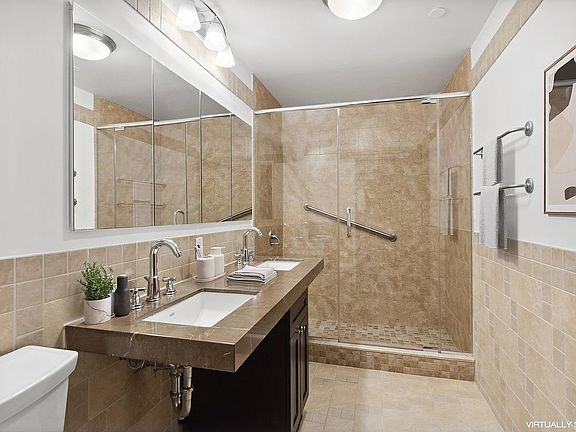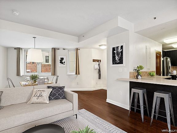 With beautiful finishes and clean contemporary lines, Unit 1C offers a surprising amount of space and features an inviting entryway, a well-appointed open concept kitchen with Caesarstone countertops, a suite of premium stainless-steel appliances, a clever breakfast bar, and lots of custom espresso wood cabinetry. The large living and dining area has windows in both the front and back and includes plenty of room for a dining table and a full living room set up. The king-sized master bedroom features oversized windows, a great California Closet, an en-suite bath with a double vanity, and a large walk-in shower. There's a spacious second bedroom with another California Closet, a bright second full hall bath, beautiful cherry floors throughout the unit, multi-zone heat and air conditioning, an in-unit Miele washer and dryer, and a video intercom door system.