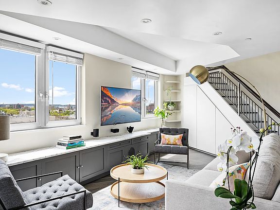 Convertible 3 bed Duplex Condo in Prime Park Slope, spectacular private outdoor roof terrace, option to purchase Deeded Parking Spot. Just imagine, you enter into your building, ride the elevator to the top floor to your penthouse apartment in one of the best sought after Brooklyn neighborhoods. The living space is open and welcoming. Wall to wall windows drench the apartment with natural sunlight, framing and mapping the incredible views of Brooklyn city skyline. The kitchen is airy, open plan, comfortable layout, marble island, Viking appliances, and essential food disposal, customized storage cabinets throughout and beautiful wood floors. There's plenty of dining area to host large dinners or enjoy everyday meals. The 2 generous size bedrooms and 2 bathrooms are on the main floor. Both have the same incredible views sweeping across the city skyline. The primary bedroom suite is a bright generous space with built-in custom closets. Storage heaven. The en-suite bathroom has custom cabinetry, double sinks and under floor heating. The second floor of the apartment houses a heavenly sky-top room equipped with a custom Italian Murphy bed. This amazing bright space is perfect for a 3rd bedroom or home office. At sunrise, take your energy up to your private terrace, make it yoga hour or enjoy your peaceful morning coffee as the city comes to life. Entertain friends anytime and share those breathtaking views of Brooklyn and Manhattan. Your new home is a duplex condo doorman apartment building located in vibrant Prospect Park neighborhood. Take full advantage of park life all year round as Prospect Park is close enough to call your own back yard. Have access to the best restaurants and shops in Brooklyn, visit the grand Army Plaza green market for your fresh local produce. Forget about the worries of where to park your car with an option to buy a deeded parking spot in the building. You couldn't have a better commute if you need to hit the city for business or pleasure. Turn those luxuries you dream of into realities. Live the full Brooklyn life at 145 Park Place. Looking for a home without compromise? Come and take a tour.