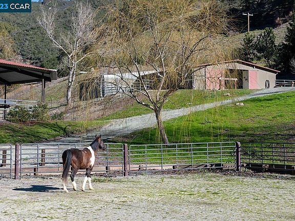 Welcome to La Casa Caballista - The Horseman House. This splendid equestrian home is nestled in the heart of the Las Trampas Regional wilderness. Enjoy an air of privacy & escape from the urban hustle, yet it is less than 4 miles from every convenience. This one-of-a-kind property boasts almost 5 acres completely surrounded with all new metal fencing, security gate with keypad/speaker, elegant driveway along the grazing pasture, a lighted 240’x85’ arena, lighted round pen, fire pit seating area, 2 barns with a total of 8 stalls, storage tack room & separate driveway directly to the lower barn. The 3,632sf rancher’s dream, with spectacular views from every vantage point, holds 3 beds+retreat/office (could be 4th bed) & 3 full baths. The lower-level au pair/in-law includes 1 bed, full bath, kitchenette, living room, private patio & front door. Hickory Wood floors & cabinets, Thermador SS Appls w/Built-in Fridge, French doors, Quartz counters, center island in granite, rustic mahogany front door, remote controlled skylights, Pella windows, new HVAC system/ducting, wood beam ceilings & Town & Country gas burning fireplace. Gorgeous sunsets & starry nights over the Las Trampas Hills. Discover the peace & serenity of La Casa Caballista for yourself!