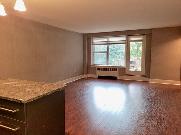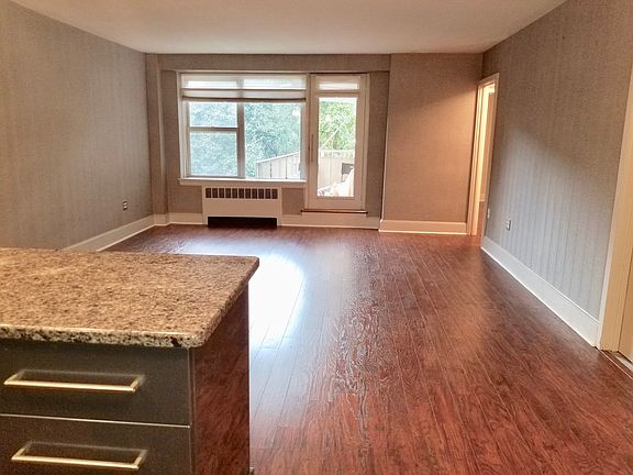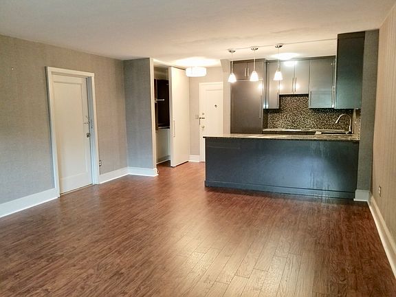 Absolutely the best location. This large one bedroom home features brand new wood flooring, open, renovated kitchen with European flare. Generous size bedroom, loads of closet space and updated bathroom. Enjoy serene views of the courtyard from every window and your own private deck! Steps to everything the city has to offer with easy access to all major routes and public transportation. There is 24 hour door service, common roof deck, common laundry and private storage.