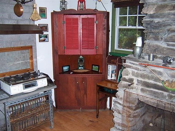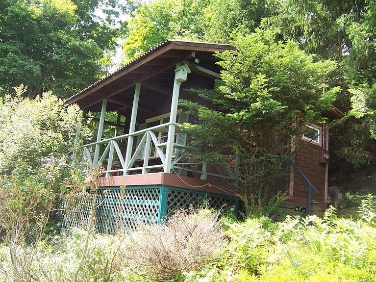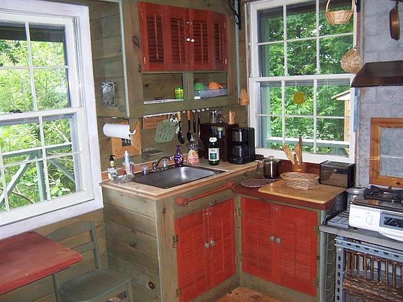 Cozy and Carefree: This unique cabin was built and maintained with great care and offers all the amenities you need in a brilliant, intimate package for the perfect escape weekend. One room with stone fireplace, bunk beds, galley kitchen, wide plank floors, accent lighting , lots of storage. A very private shower room!! Covered porch with beautiful views to sit and marvel at the peace and quiet. Or, cool off in the stream on the property.