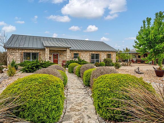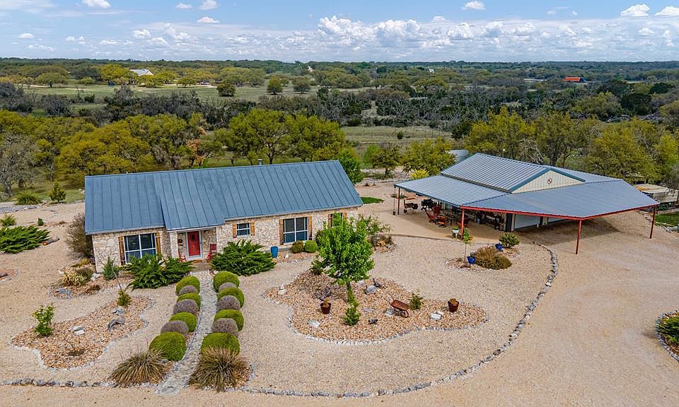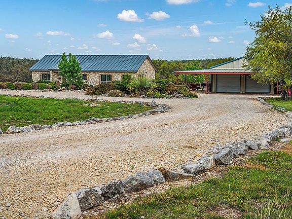Get away from the city and live the hill country lifestyle on a beautiful partially manicured 8 acres. This ranch style rock home has been well maintained with 3 bedrooms and 2 bathrooms--the main bedroom features an ensuite with a clawfoot bathtub, freestanding shower, water closet, dual vanities, and a walk-in closet. The living room has a high vaulted ceiling, a woodburning stove, & French doors that lead to the back patio. The kitchen has black appliances, custom cabinets, granite countertops, a large pantry and a very unique, custom island with a hammered zinc top. The utility room is attached to the dining area with additional cabinets, deep sink, and central vacuum. Outdoors there is a ~625sf workshop with 16' awnings on 3 sides creating a great outdoor living space with space for seating, dining, and grilling out, a 2 car carport on the front and additional covered parking for ATVs, lawn equipment, etc. Workshop has two rollup doors, a fan, insulated ceiling, and plenty of lighting. The land is fully fenced with a mix of oaks and some cedar and a wet weather creek. Hunting, goats, chickens, or horses are allowed. Wildlife exemption is in place and managed by HOA-$10/year.