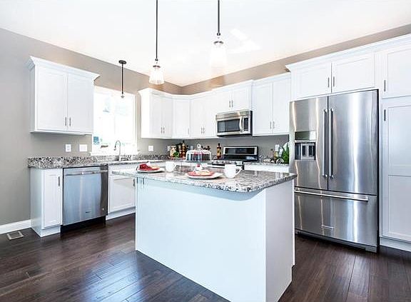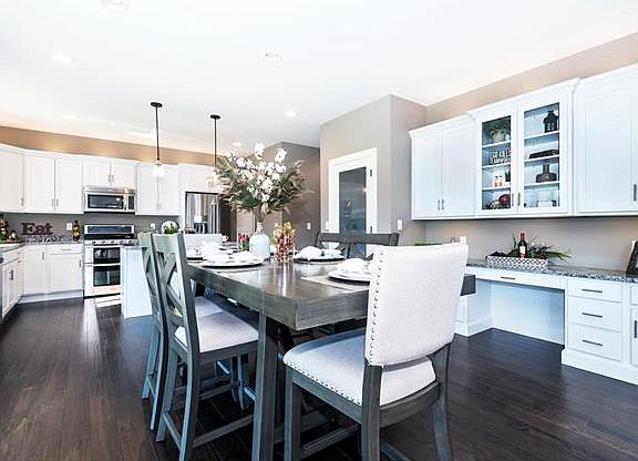 2 story home ready to move in! Home is loaded with many upgrades! Handscraped wood floors on main level, beautiful white cabinets, center island, stainless steel appliance package, and granite counter tops. Loaded with canned lighting,Gas FP rustic bronze accents open living room with 9 ft ceilings on main level. Formal dining room, w/open floor plan. 3 panel slider leads to cover backyard patio. Wrought iron spindles leads to upper level w/master bath suite, cathedral ceilings, w/barn style door, double bowl vanity, sep glass enclosed shower and soaking tub. Nice size bedrooms and bonus room and upper laundry. Finished lower level with family room, 4th bedroom, and full bath. Sodded yard and professional landscaped. 3 car insulated garage, and upgraded brick front, plus many more options.